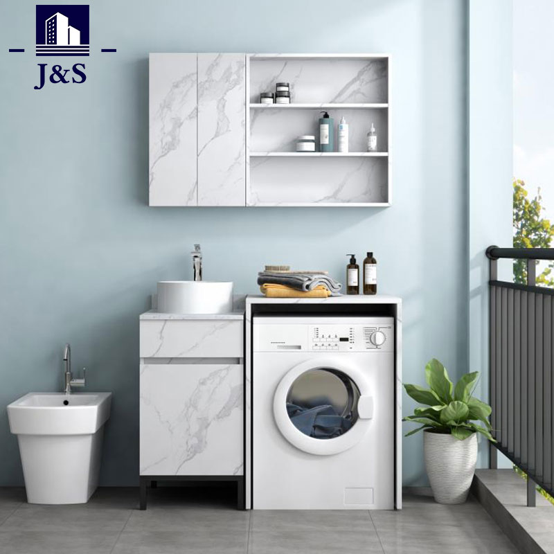 Der Badezimmer-Waschtisch in Marmoroptik besteht aus hochwertigem, feuchtigkeitsbeständigem Sperrholz als Schrankkörper, Blum-Dämpfungsscharnieren und einer feuerfesten Platte mit Marmorstruktur. Es kann als Badezimmerschrank oder Waschküchenschrank bezeichnet werden.