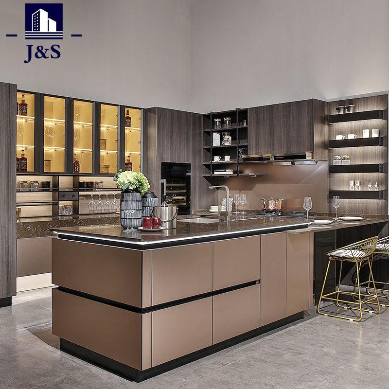J&S liefert Mateiral Mateiral Außenküchen mit eingebauten Küchendesigns. Küchendesign in metallischer Champagnerfarbe, hochwertige obere Küche aus lackiertem Holz und Glas.