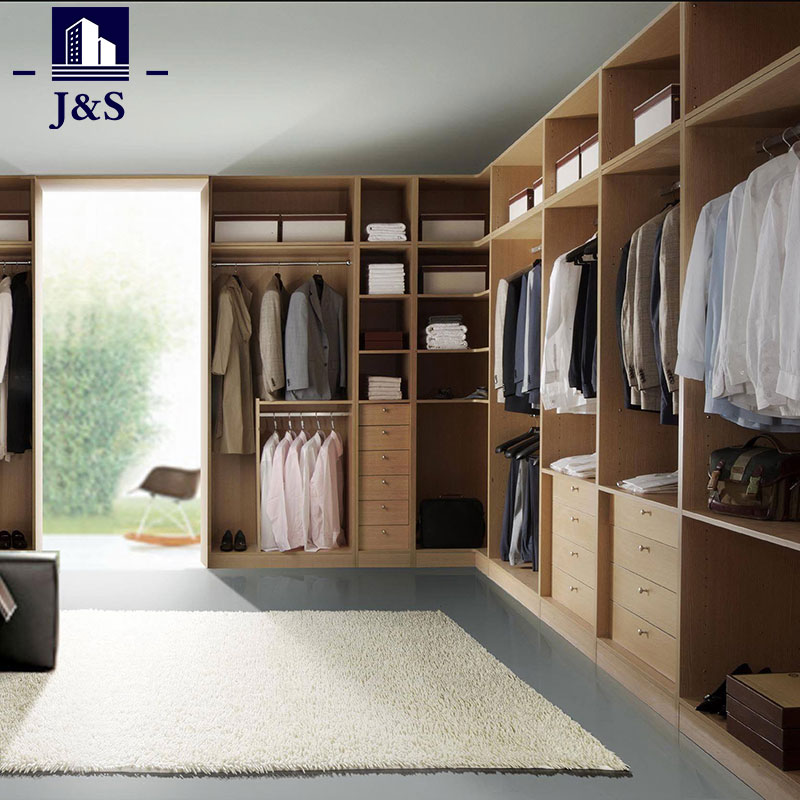 Wir liefern einen begehbaren Kleiderschrank für kleine Schränke. Ein U-förmiger begehbarer Kleiderschrank mit Walnussholzmaserung entführt uns in eine Welt der Natur.